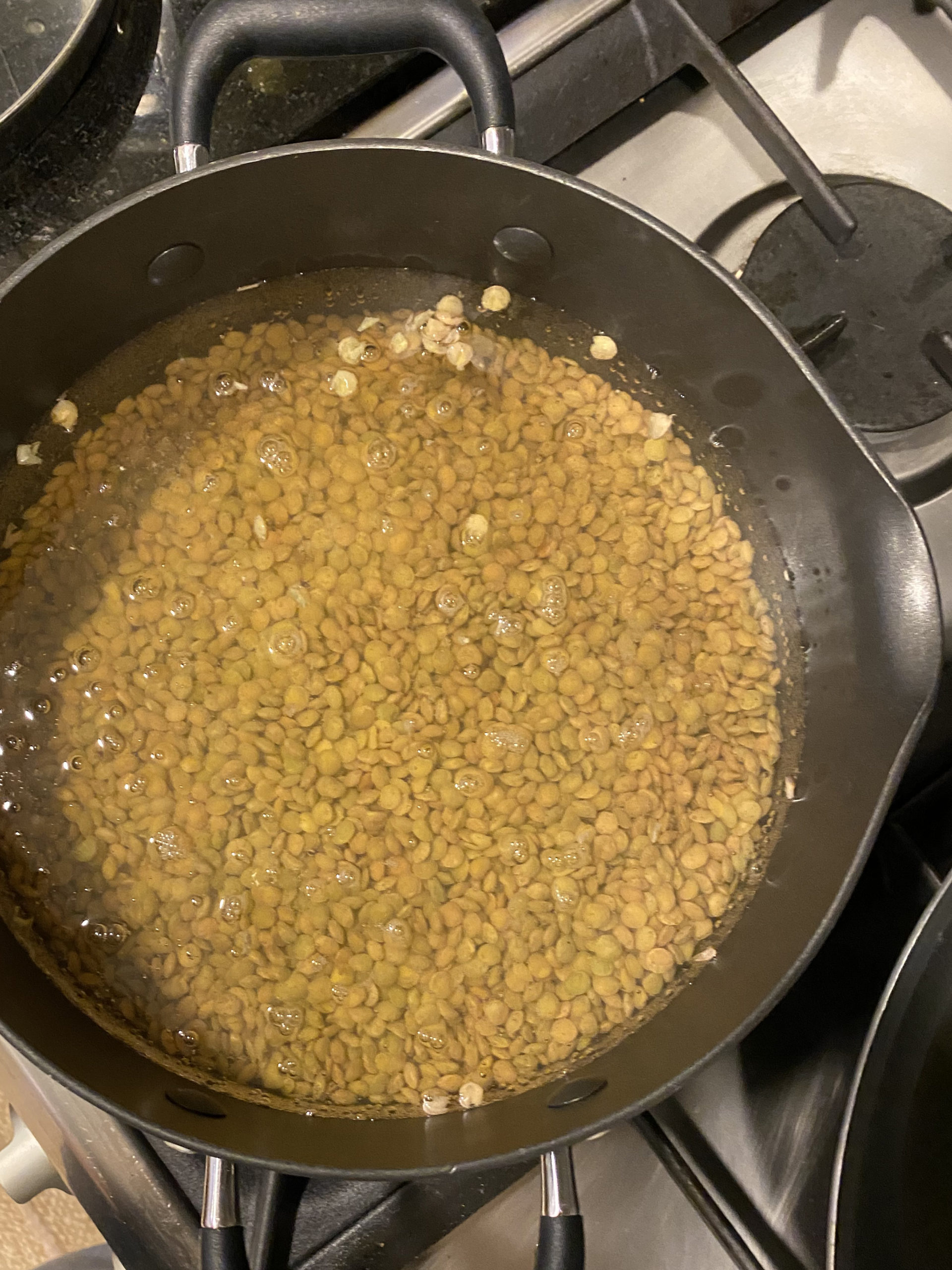 - Boil the lentils in salted water until tender (usually about 30-40 minutes). You can add water progressively as the water is absorbed by the lentils.